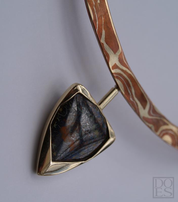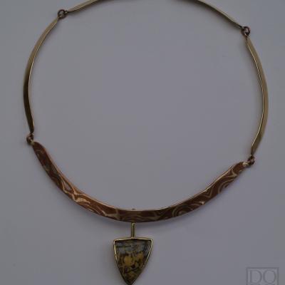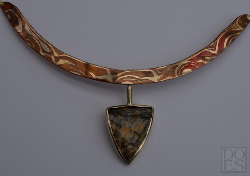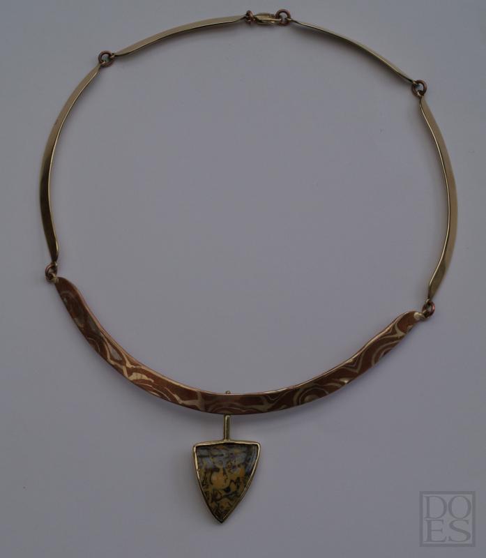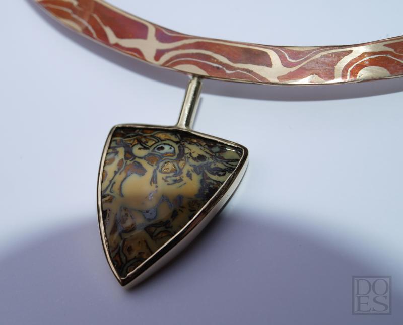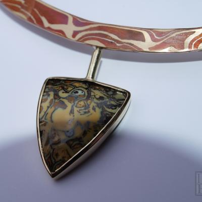 Collier "Papillon" is gemaakt van Mokume-gane (koper,14kt. geelgoud) met een opaal in een 14 kt geelgouden zetkast die kan draaien. Zie foto 4 de achterzijde van de zetkast met opaal. Het collier bestaat uit vijf segmenten, vier in 14 kt.geelgoud en het middenstuk van Mokume-gane, verbonden met elkaar d.m.v oogjes.