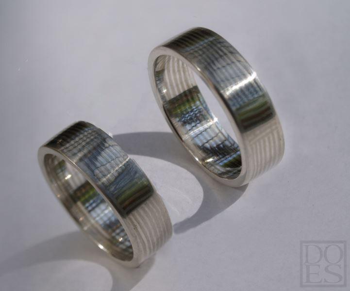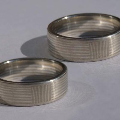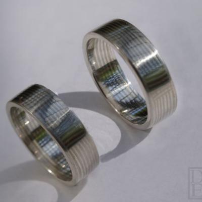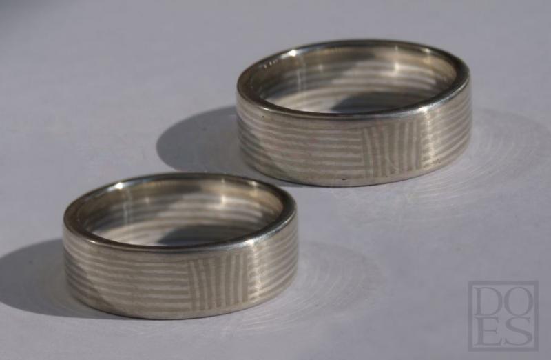 Trouwringen gemaakt van zilver en witgoud. Patroon: streepjes.